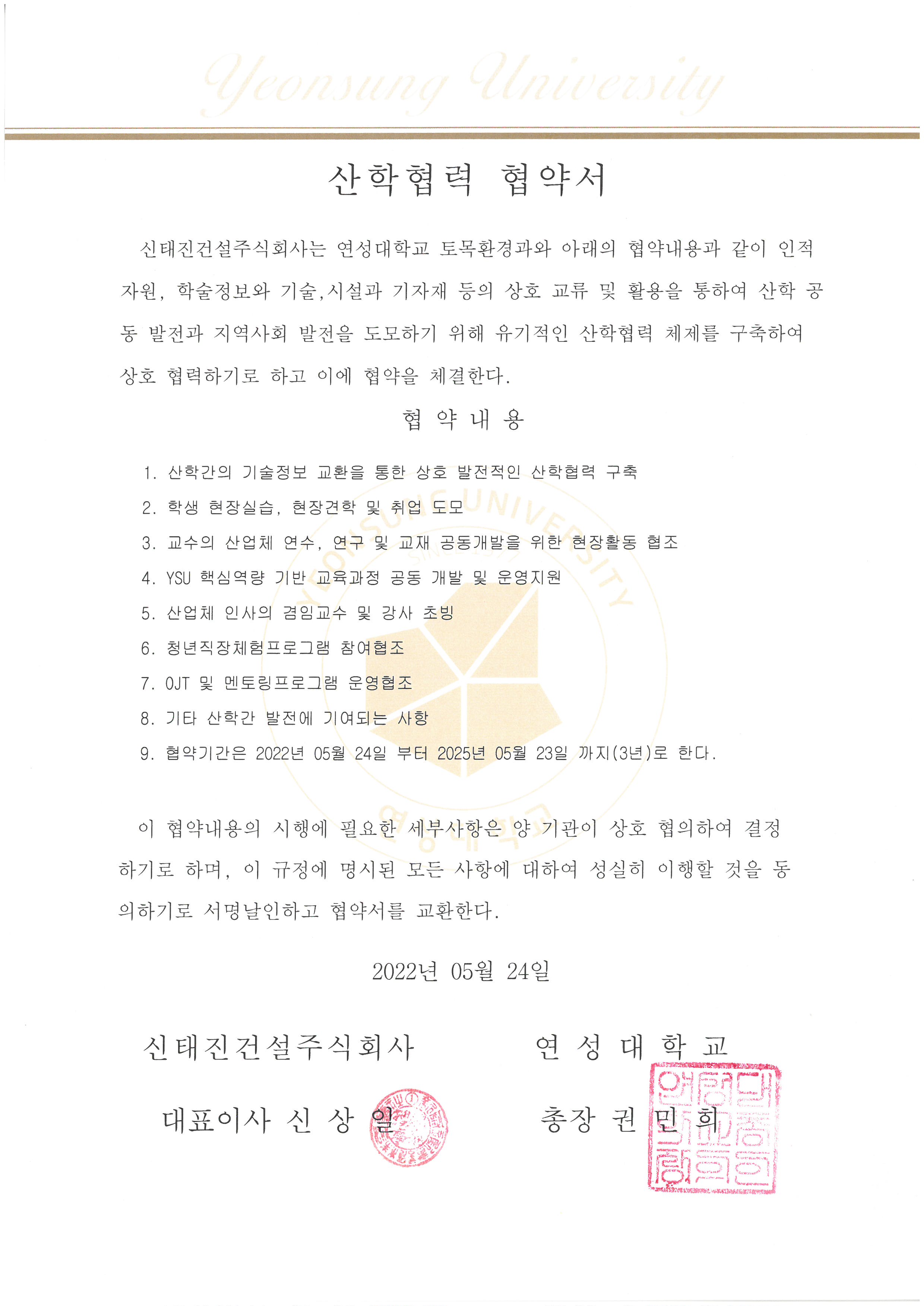 2022.05.24(È) ¿¬¼º´ëÇб³ Åä¸ñȯ°æ°ú »êÇÐÇù·Â Çù¾à ÁøÇà - ÀÎÀûÀÚ¿ø, ÇмúÁ¤º¸¿Í ±â¼ú, ½Ã¼³°ú ±âÀÚÀç µîÀÇ »óÈ£±³·ù ¹× Ȱ¿ëÀ» ÅëÇØ»êÇаøµ¿ ¹ßÀü°ú Áö¿ª»çȸ ¹ßÀüÀ» µµ¸ðÇϱâ À§ÇÑ Çù¾àÀ» ü°áÇÏ¿´½À´Ï´Ù.